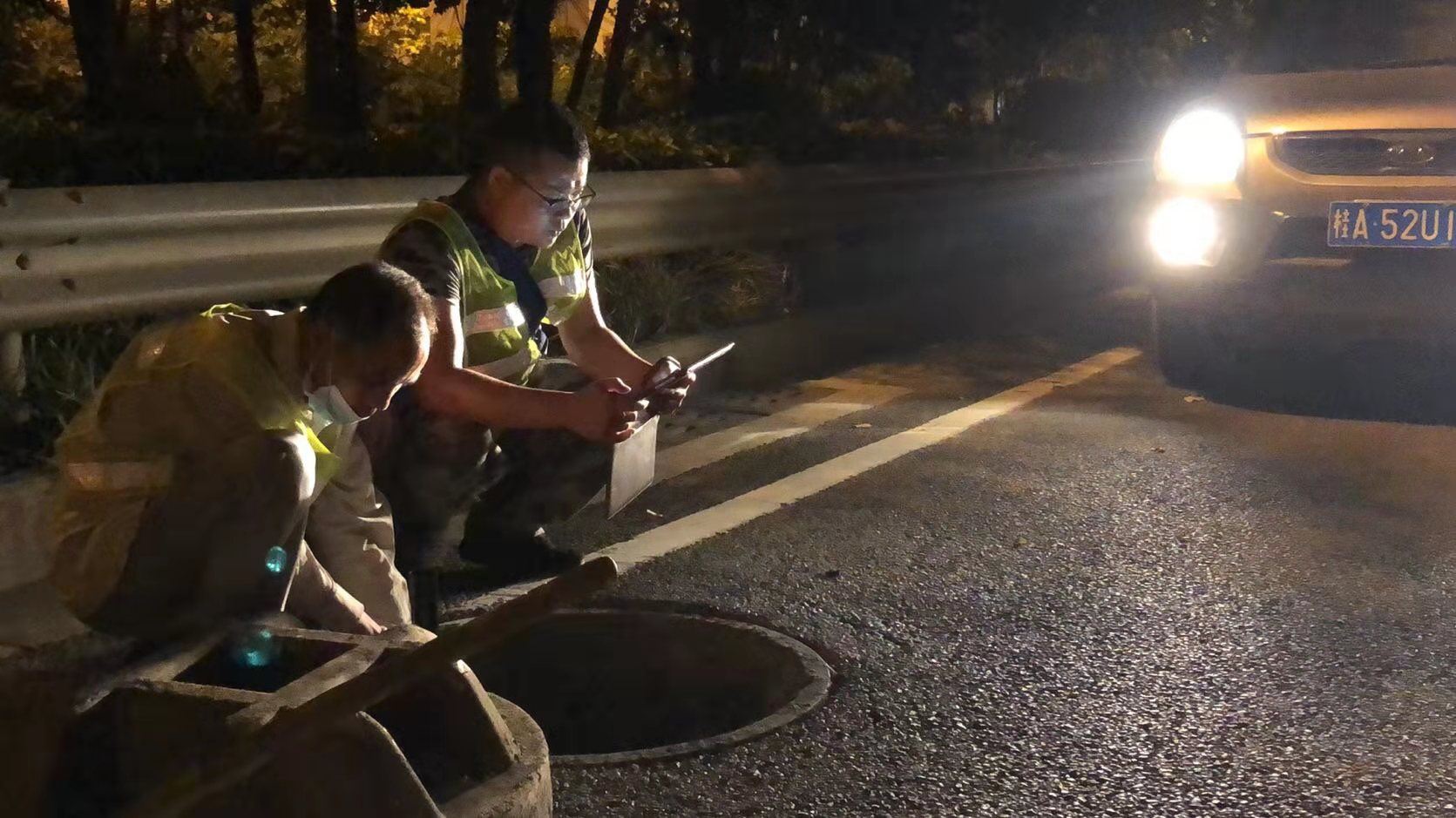 唐苑(右)在夜間排查